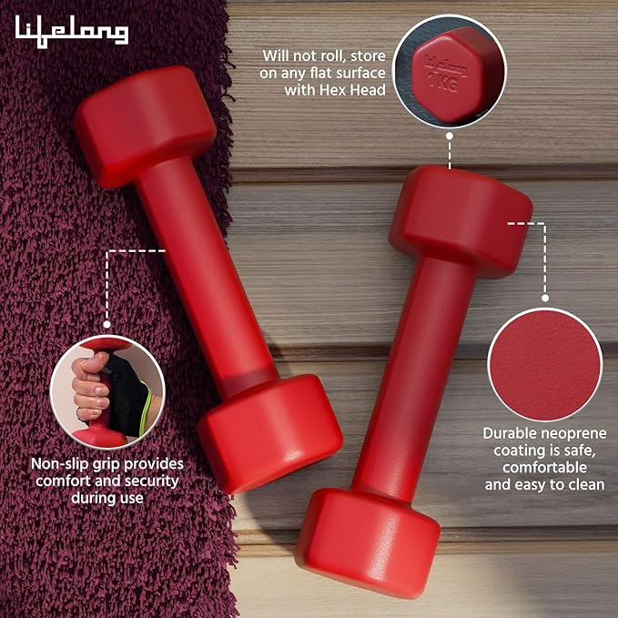 Brand Lifelong Colour Lifelong Neoprene Dumbbells Set of 2 (1kg x 2) – Fixed Weight Set for Home Gym, Fitness, Gym Exercise, Home Workout – Weights for Men & WomenLifelong Neoprene Dumbbells Set of 2 (1kg x 2) – Fixed Weight Set for Home Gym, Fitness, Gym Exercise, Home Workout – Weights for Men & Women Item Weight 2000 Grams Material Neoprene Special Feature Non Slip