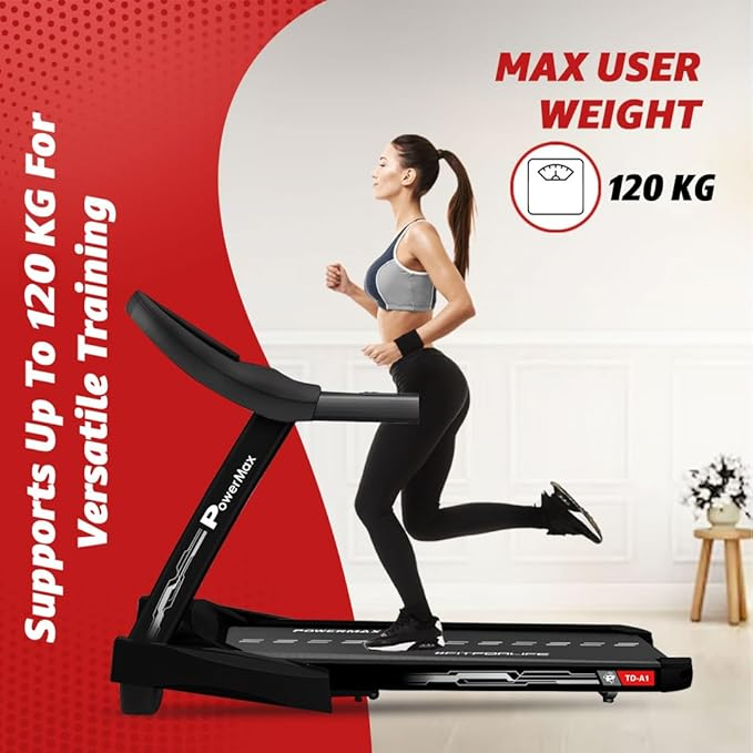 • With a maximum user weight capacity of 120 kg,PowerMax Treadmill accommodates various users For enhanced longevity and performance, Powermax recommends factoring in an additional 30KG buffer for Running Consider your weight as a reference point for selecting the treadmill's capacity For example, if your weight is 90 kg or less, a 120 kg max capacity treadmill is suitable for Running