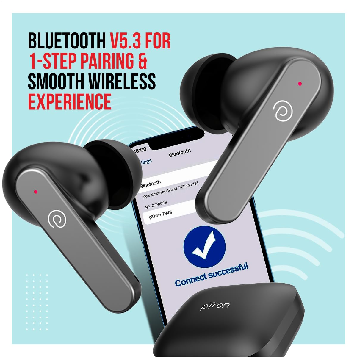 pTron Earbuds, TruTalk AI-ENC Calls, 36Hrs Playtime, in-Ear Bluetooth 5.3, Voice Assistant, Type-C Fast Charging